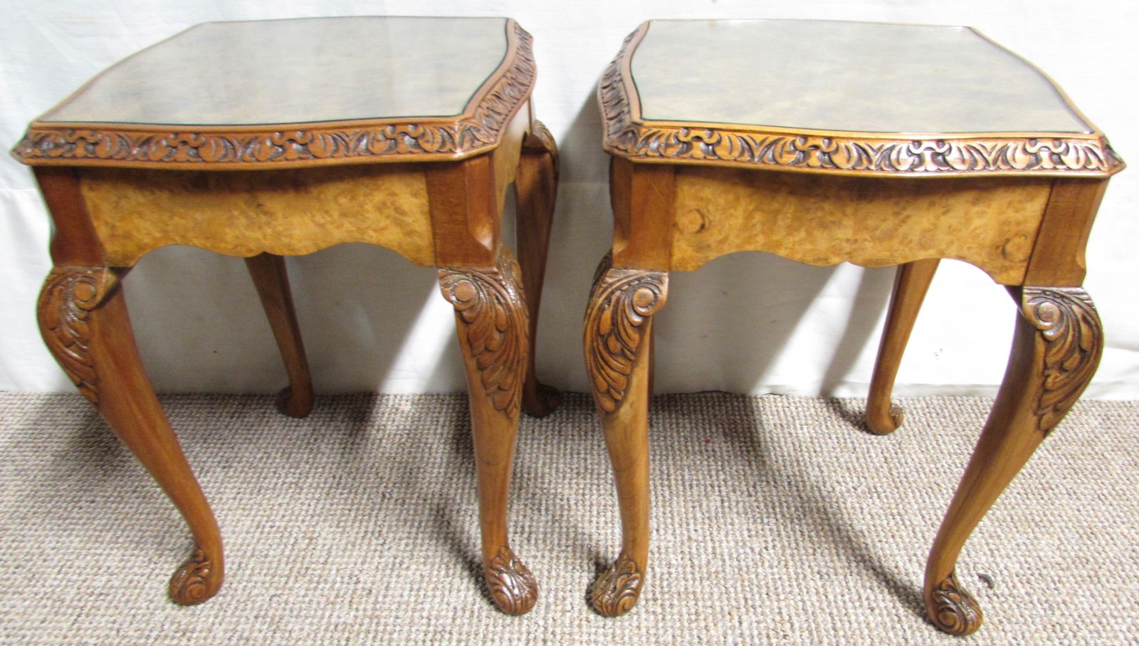 A delightful Pair of Burr Walnut Coffee or Lamp Tables, made from solid Walnut with nice Burr Walnut tops and sides. The carving is crisp and well executed. They sit on Queen Anne legs. They have glass inset tops which can be used or not as you desire.