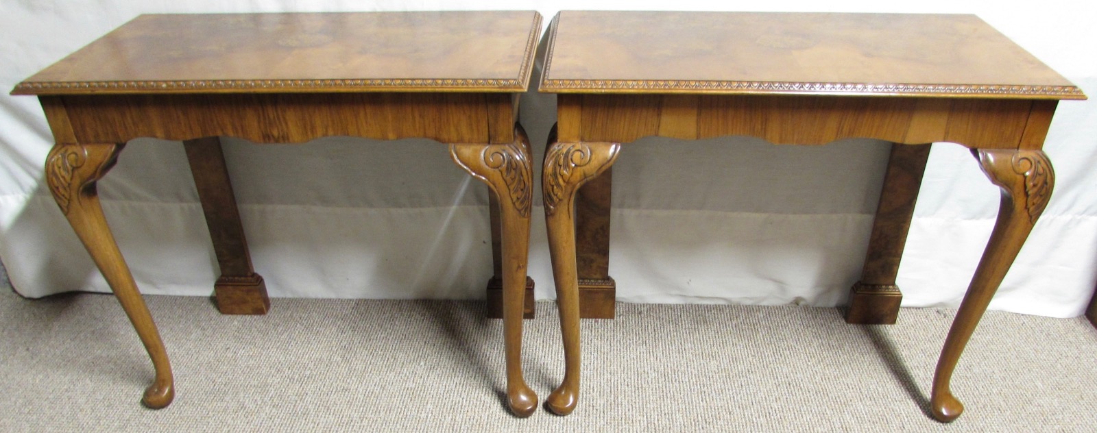 These are a nice pair of burr walnut console or lamp tables, made from solid walnut with nice burr veneers to the top. The carved border is crisp and the knees have carved decoration, they sit on Queen Anne legs.