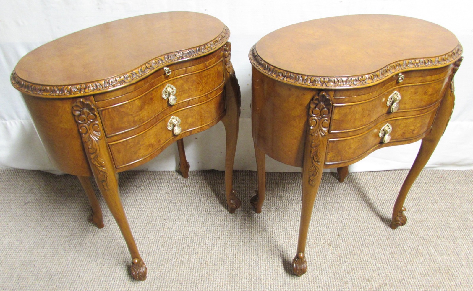 A stunning quality pair of bedside drawers or bedside tables, made from Walnut with excellent burr walnut to the tops and right round. Each has 2 smoothly running drawers and a slide above all fitted with original brass handles. The kidney shape is very rare and the quality of these is much higher than the normal, The carved decoration is crisp and well executed, they sit on Queen Anne legs with carved feet.