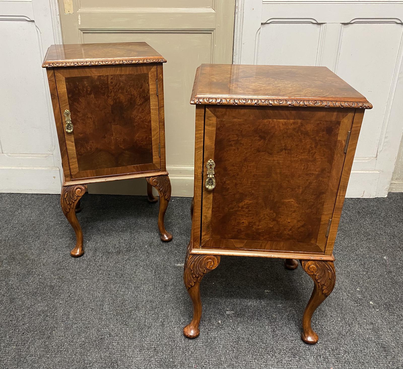 A delightful pair of burr walnut bedside cupboards or cabinets. Made from walnut each has a single door fitted with original brass handles and a shelf inside. Nice carved detailing around the top moulding and the tops of the Queen Anne legs.