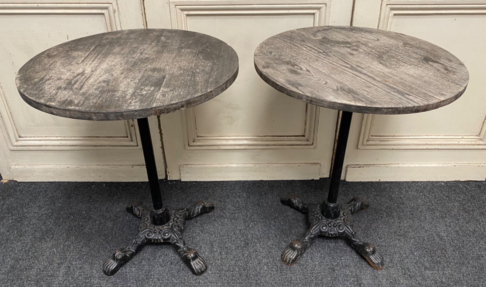 A nice pair of late 19th Century antique cast iron tables, ideally for outside but also good decorative inside tables. Black cast iron bases with later tops, the tops are probably around 50/60 years old as have a great aged look.