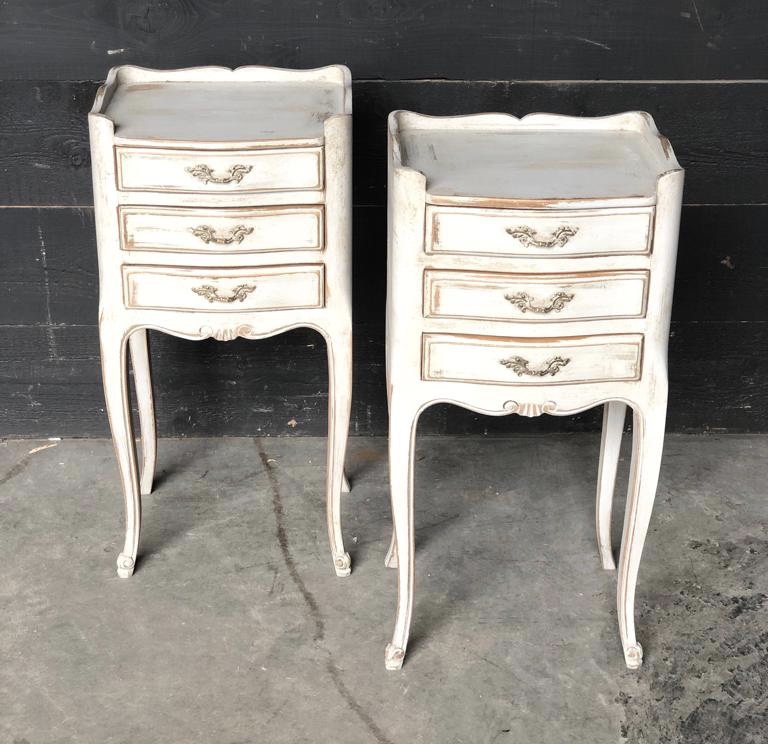 These are a lovely pair of French originally decorated bedside drawer or tables. The drawers run smoothly and they are serpentine in form.