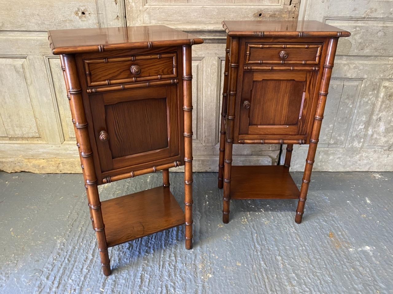 These are a delightful pair of French faux bamboo bedside cabinets or cupboards, made in the late 19th Century from Walnut and some pine. They are of excellent quality and having been re finished to a very high standard in excellent condition for the home.