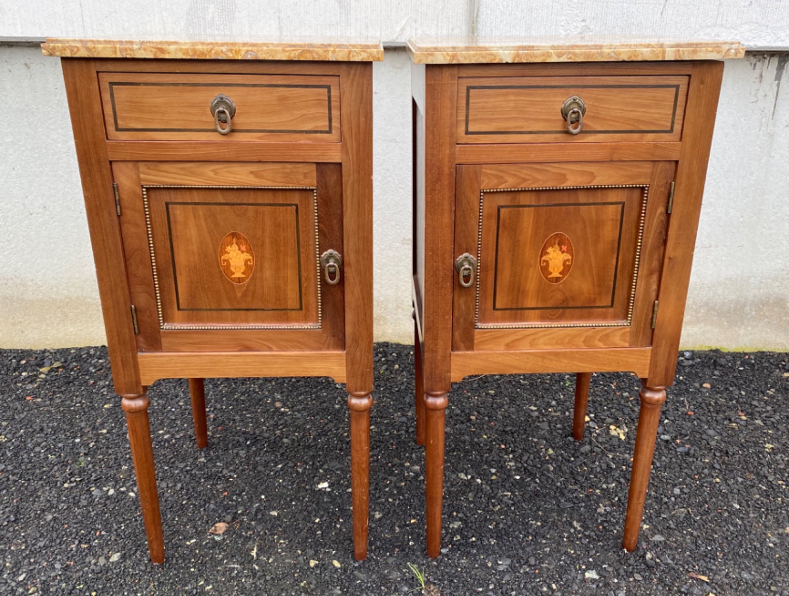 A very nice quality pair of French bedside cupboards or cabinets, made from mahogany and having lovely variegated marble tops. Each has a smoothly running drawer with cupboard under. The handles are original and they sit on elegant tapering legs.