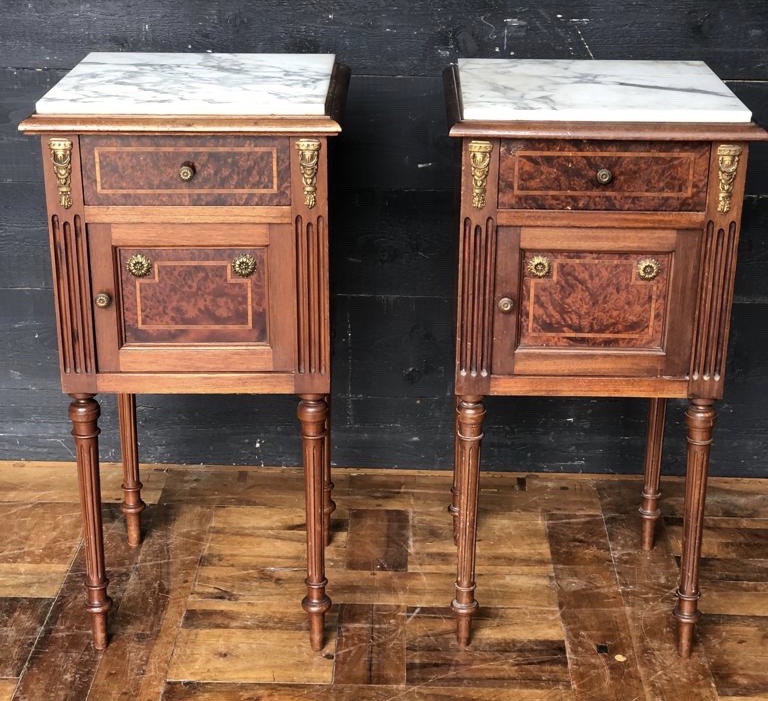 A lovely pair of Bedside Cupboards or Cabinets, French made from Walnut with Kingwood and amboina and tulip cross banding. Fitted with nice quality original ormolu mounts and handles. The original marble tops are in perfect condition.