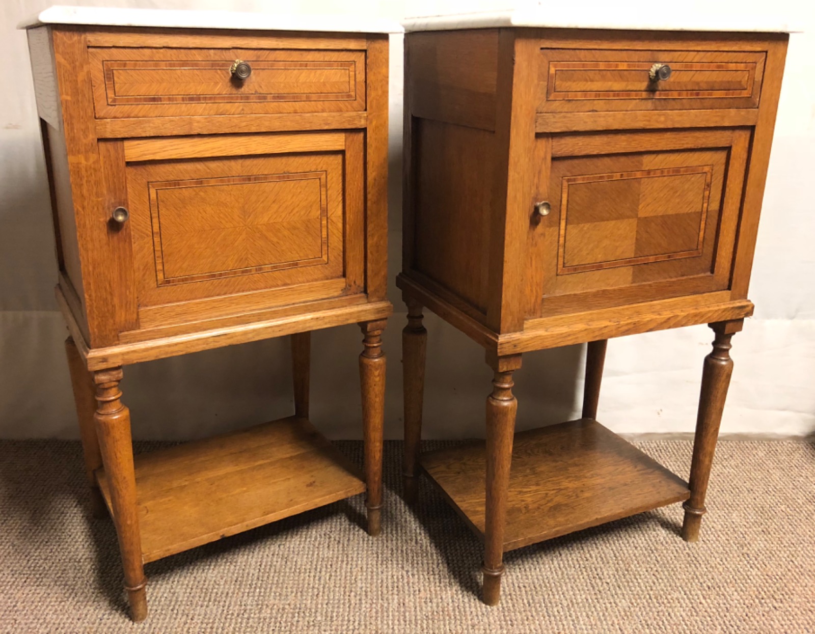 A nice pair of French Bedside Cupboards, Cabinets or Tables made from solid oak with tulip cross banding to the doors and drawers. The single drawer slides smoothly fitted with a brass handle, the cupboard opens to reveal a porcelain lined interior and also fitted with a brass handle.