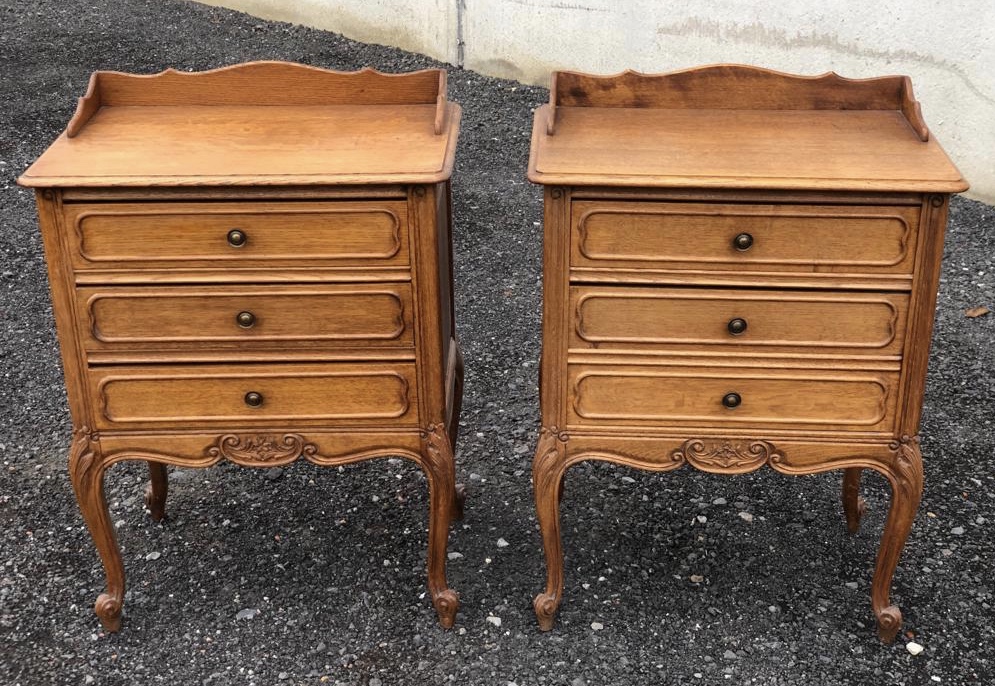 A lovely pair of oak bedside chests or tables, French in origin, all the drawers run smoothly. In excellent condition for the home.