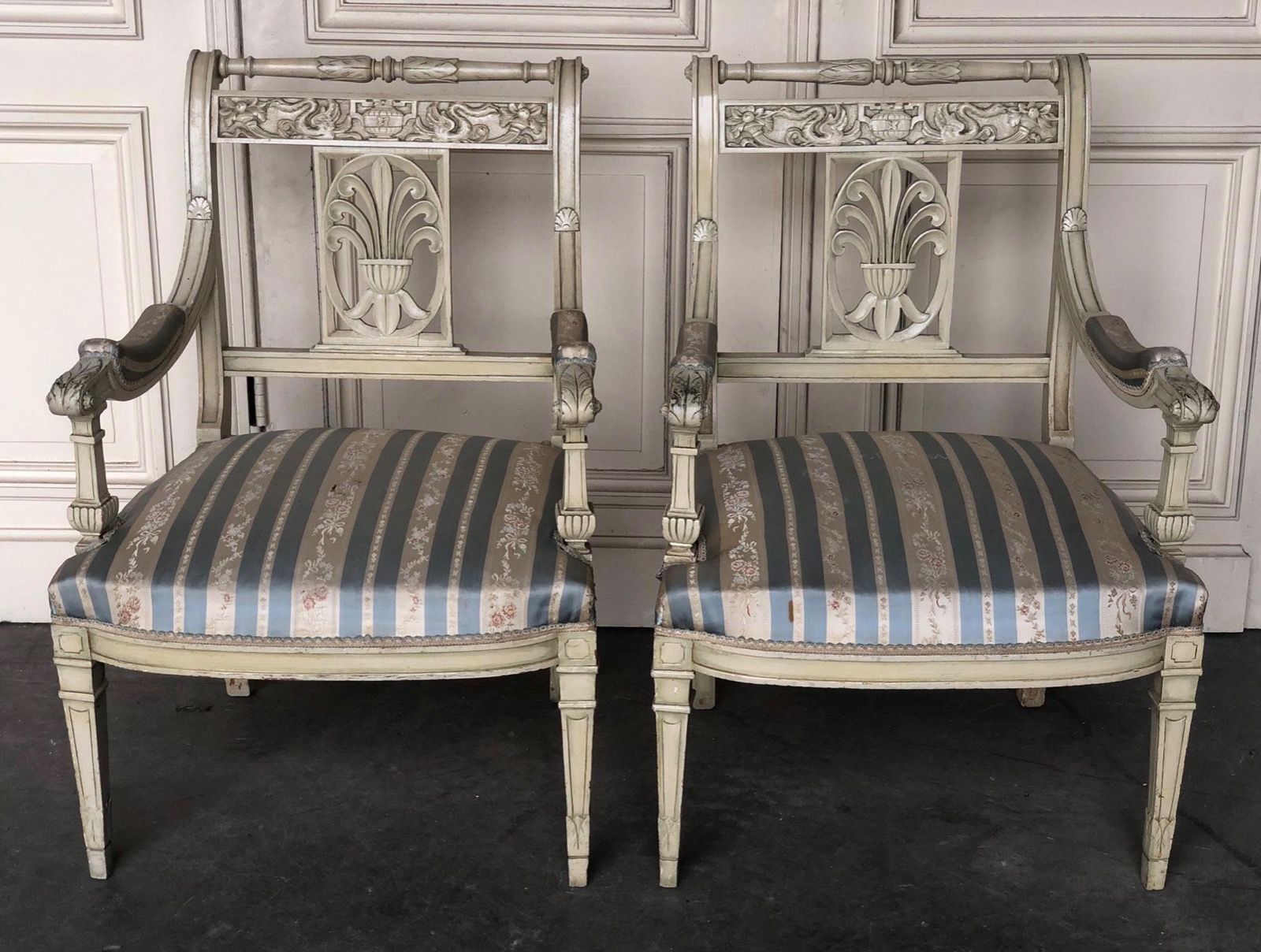 A superb highly decorative pair of French Arm Chairs, having their original paint finish with an excellent patina. They are of very good quality, the carved decoration is crisp and well executed. The upholstery is in very good condition, they are strong and sturdy.