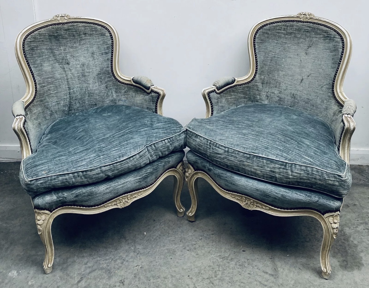 An extremely comfortable pair of French upholstered bergere arm chairs. The frames are strong and sturdy and having their original finish. The internal upholstery is excellent and comfortable. The fabric is in very good condition but you would only need to to recover in the fabric of your choice.
