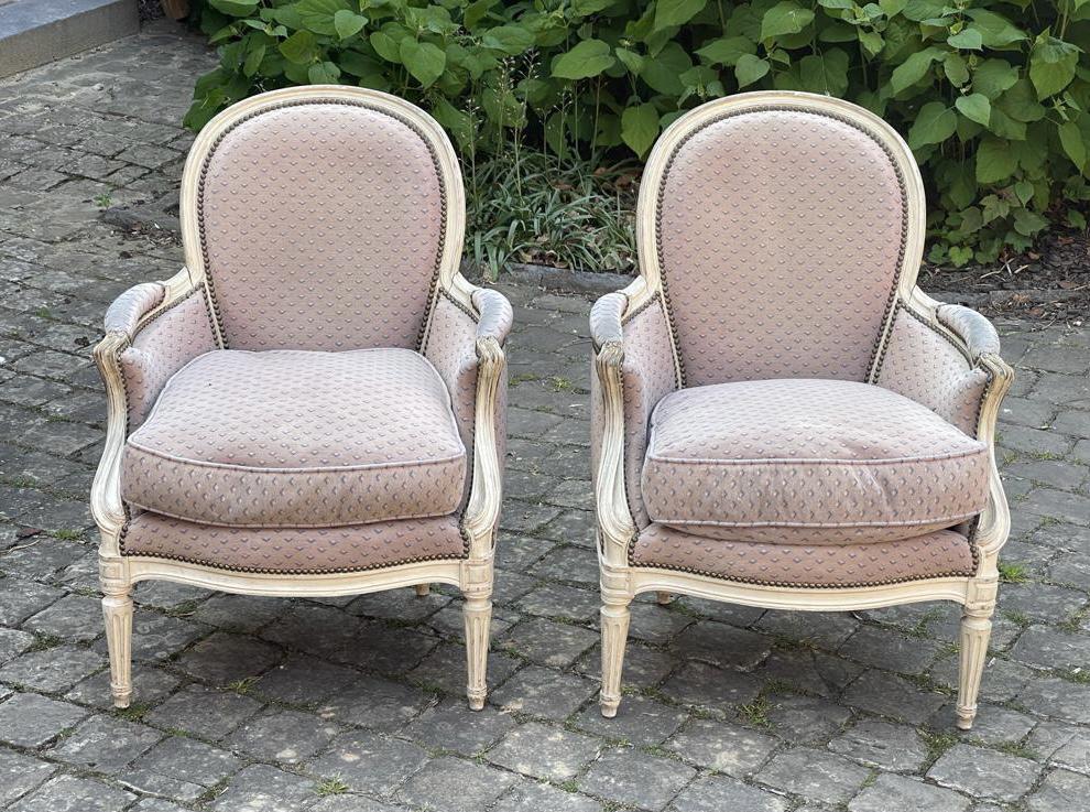 A lovely comfortable pair of French Bergere Chairs. The frames are strong and sturdy and have their original finish which has a nice worn patina. The upholstery is in good condition but perhaps you will want to re upholster in your own fabric choice.