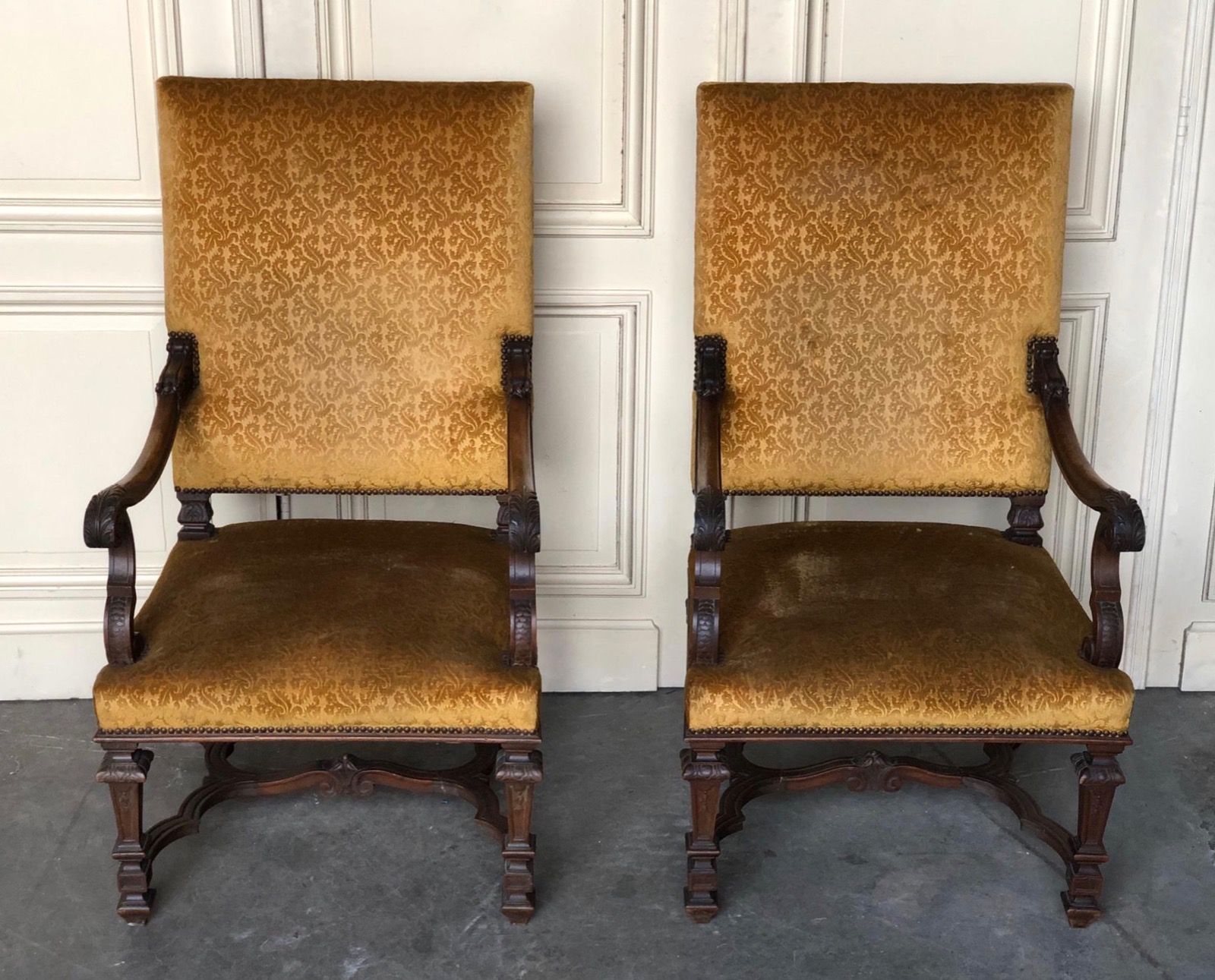 These are an impressive pair of French Armchairs, made from solid walnut and they are strong, sturdy and comfortable. The upholstery is in very usable condition.