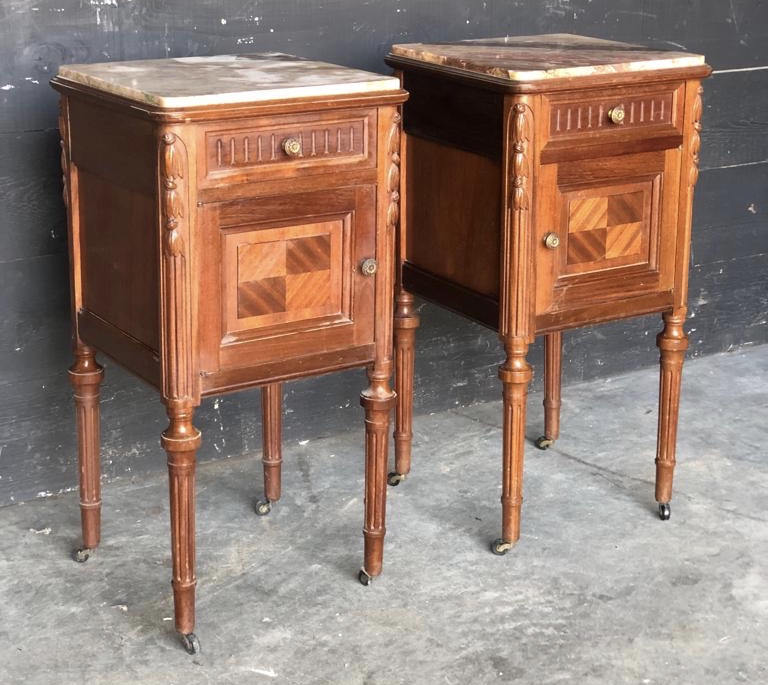 These are a fine quality pair of 19th Century antique bedside cupboards, French and made from walnut with delightful original marble tops.
