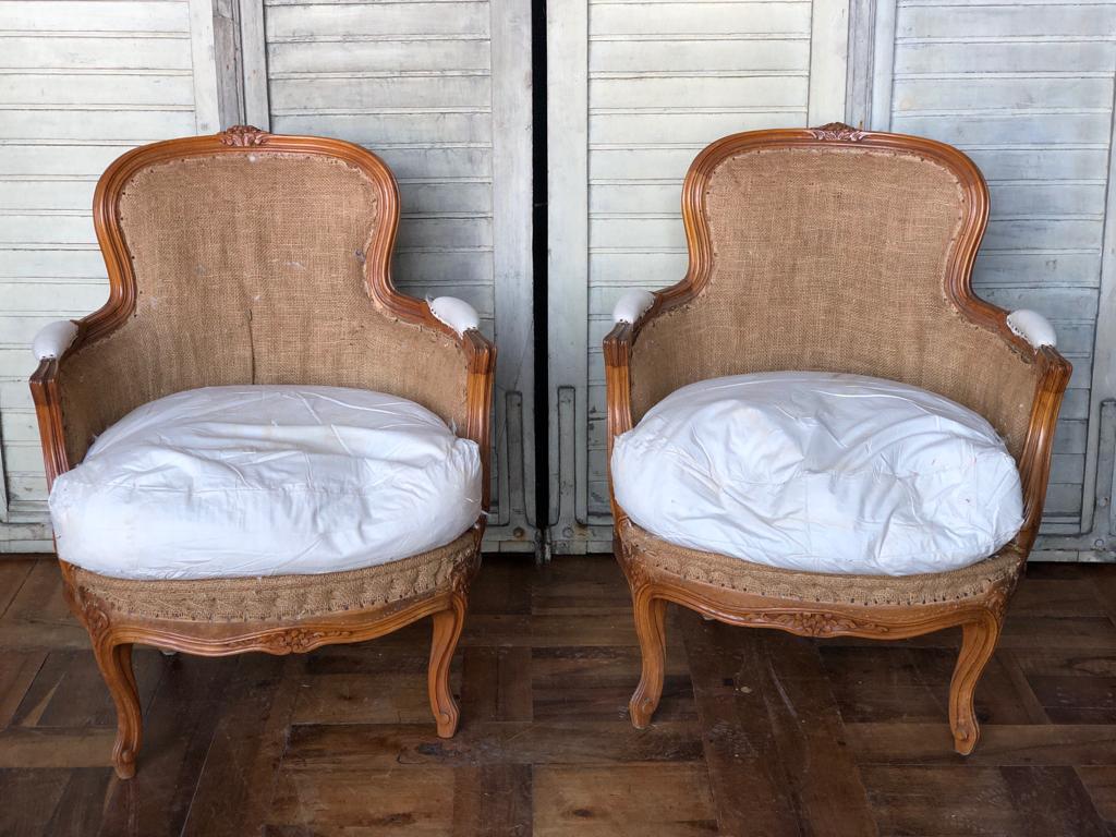 A very nice and extremely comfortable pair for French Bergere chairs, dating to the late Victorian period. The frames are solid Walnut and they are strong and sturdy. The fabric has been removed so they are ready to be Upholstered in the fabric of your choice or we can have this done for you.