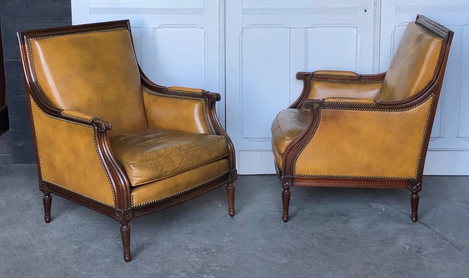 These are a delightful pair of leather arm chairs, mid 20th Century in date. The mahogany frames are strong and sturdy. The leather upholstery is in excellent condition bar 2 very small splits to the back of one please see photo. These chairs are extremely comfortable.
