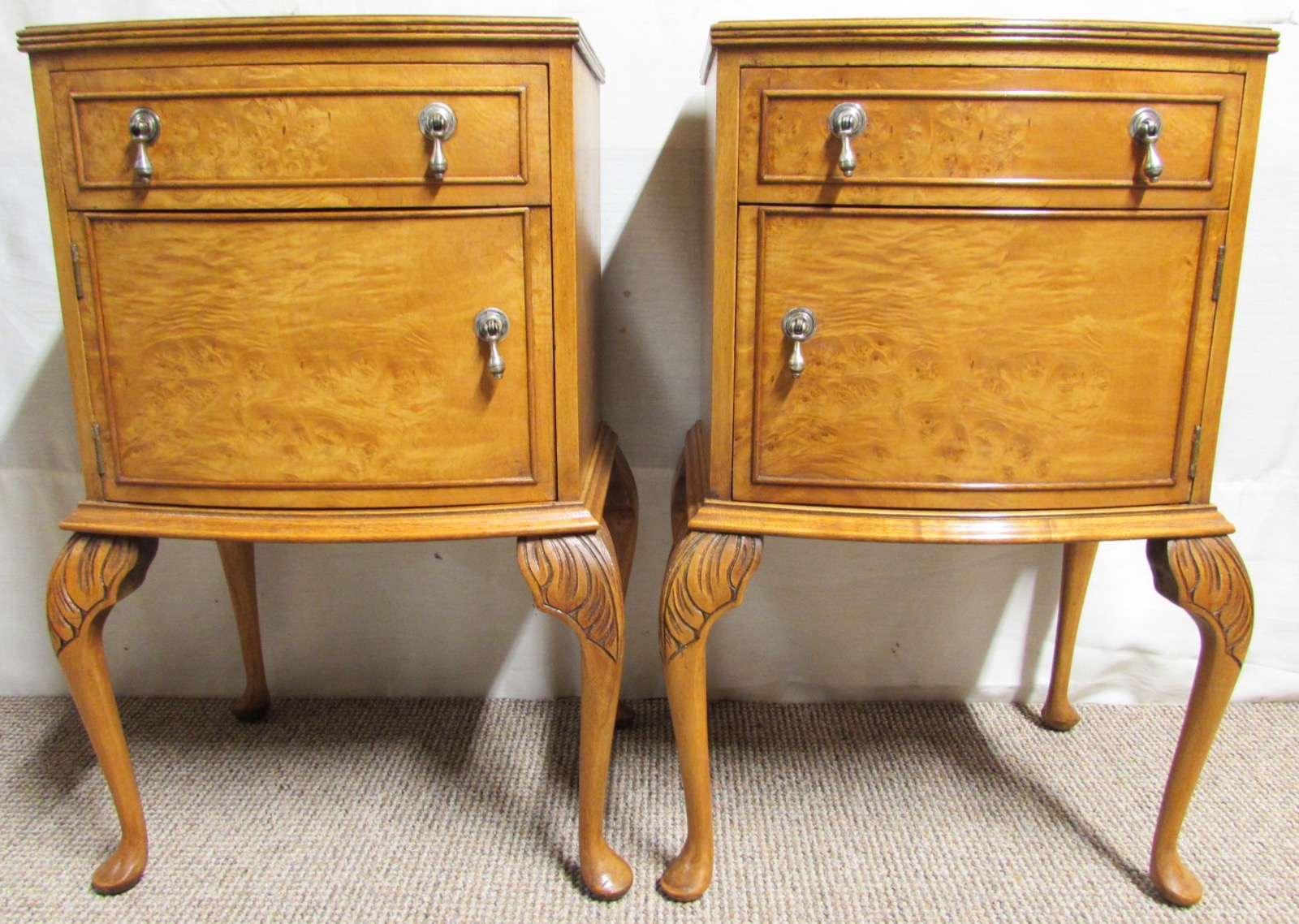 These are a lovely Pair of Bedside Cupboards, made from Walnut and bow fronted in form. The single drawers run smoothly, a cupboard below and fitted with original handles. They sit on Queen Anne Legs.