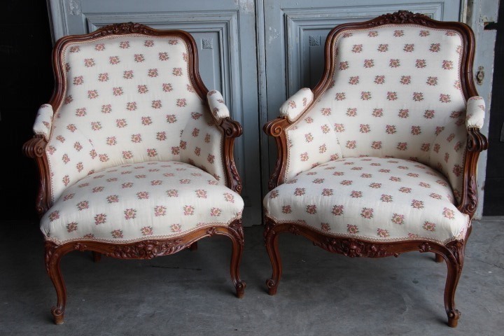 These are a very fine pair of French armchairs made from solid walnut. Late Victorian in date. The carved detailing is crisp and well defined. The frames are sound and sturdy. The upholstery has been re done within the last few years and is in excellent condition. They are extremely high quality pair of chairs, very comfortable and highly decorative.