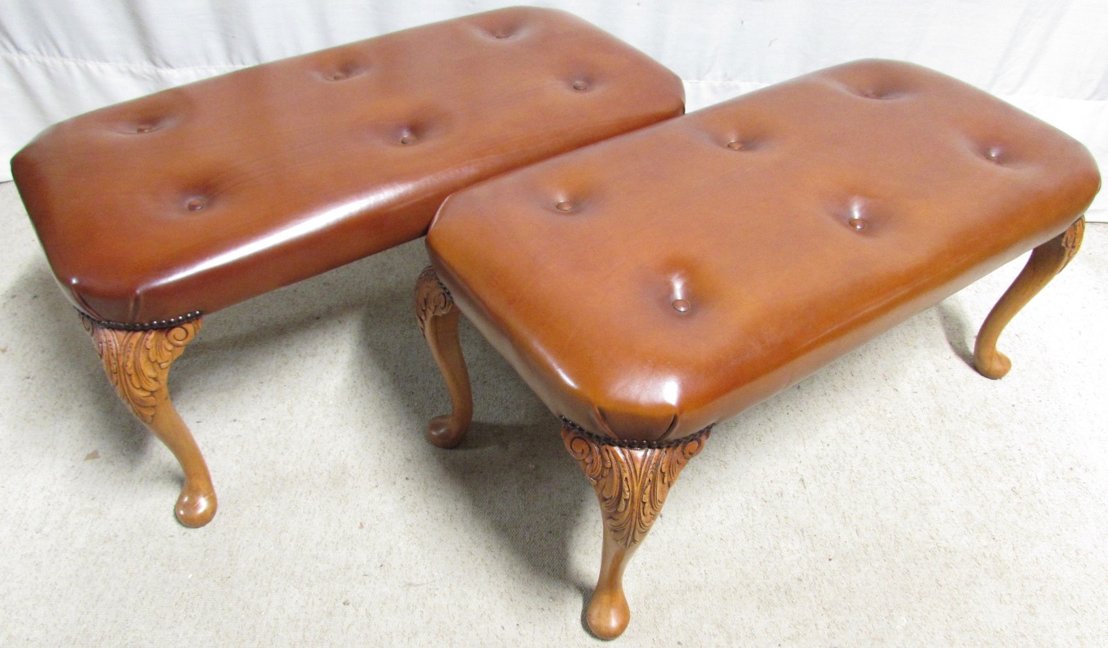 These are a wonderful pair of stools. The legs made from solid walnut, Queen Anne design and crisply carved decoration. The leather tops are buttoned and hand dyed.