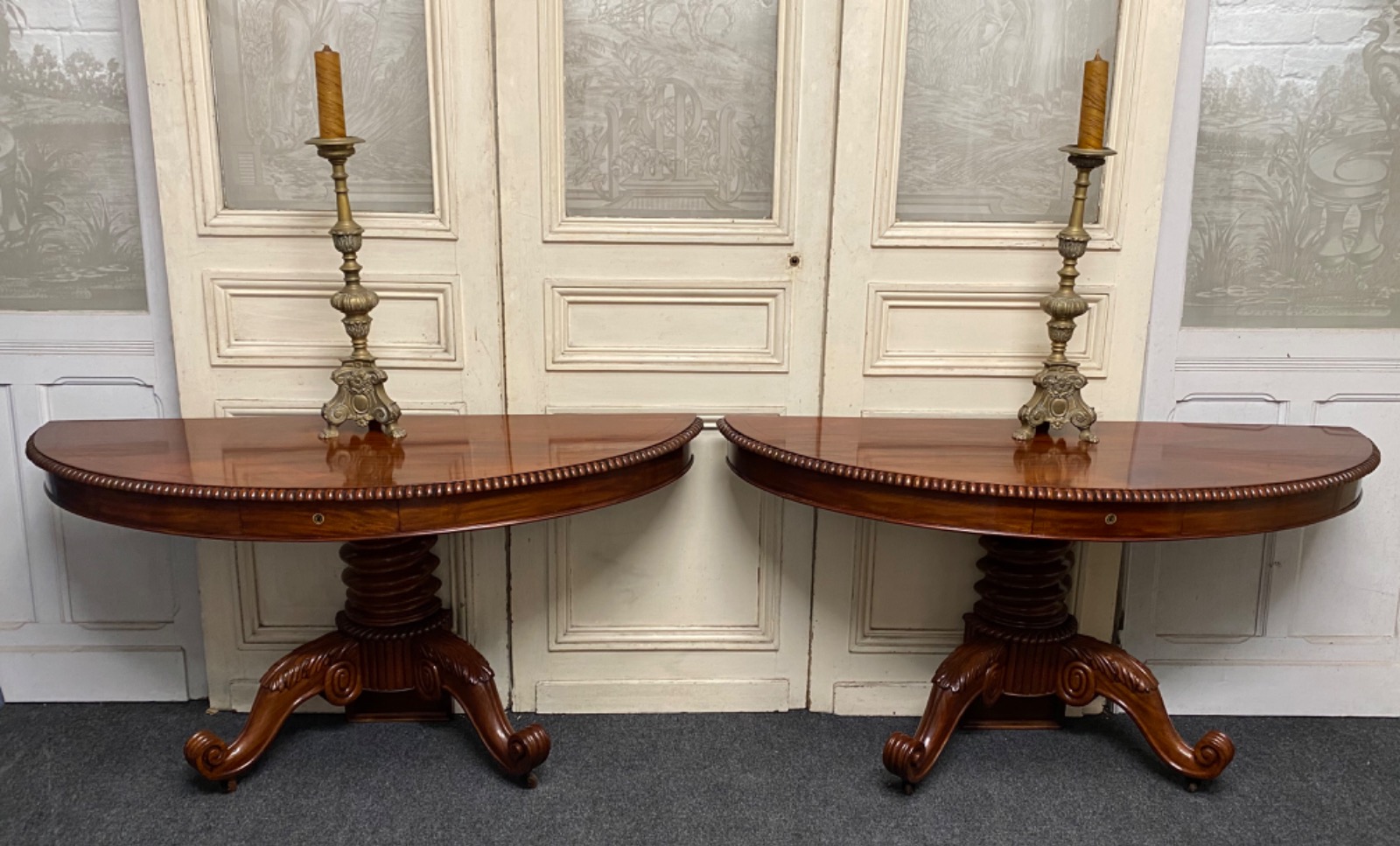 A superb quality pair of William IV Console Tables dating to around 1835, demi lune in shape and made from Cuban Mahogany, the tops have a black line inlay and each has a single drawer to the front, both lockable (key present). The bases are of classic design and the carving is crisp and well executed.
