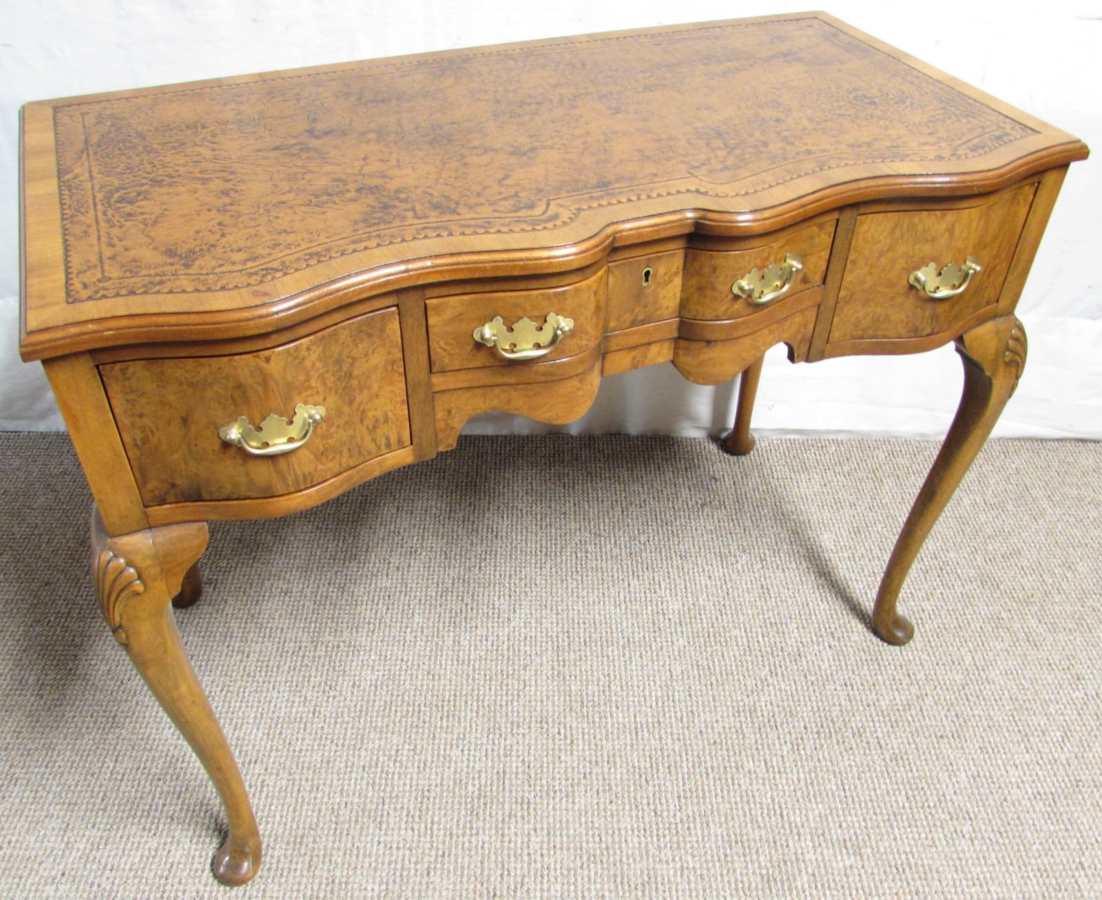 A very pretty and very good quality Writing Table or Desk, made from Walnut with nice Burr Walnut. Having 3 smoothly running drawers fitted with original Brass handles. The top has been re leathered in an antiqued light brown. The front is very shaped, serpentine in form.