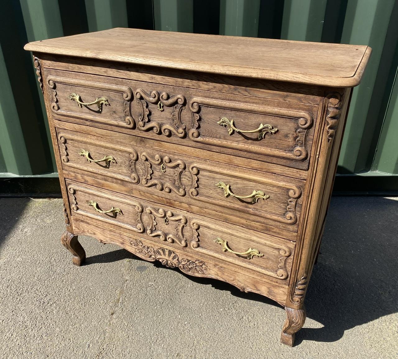 This is a delightful French oak chest of drawers which has 3 drawers with original brass handles, made from solid Oak which we have bleached for a lighter look. Dating to the early 1900s and of excellent quality construction. Nice carvings to the front and original back.