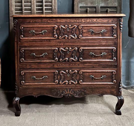 This is a lovely French 3 drawer commode chest of drawers dating to the early 1900s. Made of oak and of good quality construction with solid drawer linings and original back. The drawers all run smoothly fitted with their original handles. Nice decoration to the front and in overall excellent original condition for the home.