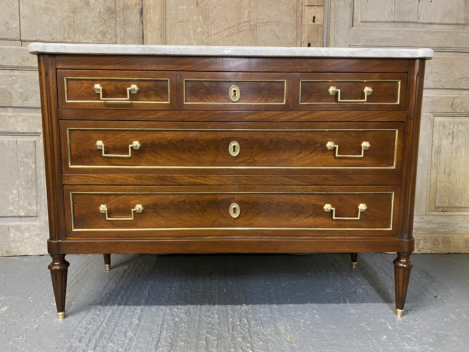 A very pretty French Louis Xvi Commode Chest of Drawers. Made from Mahogany in the early 1900s. The original marble top is in prefect condition. The 3 drawers run smoothly and fitted with original brass handles.