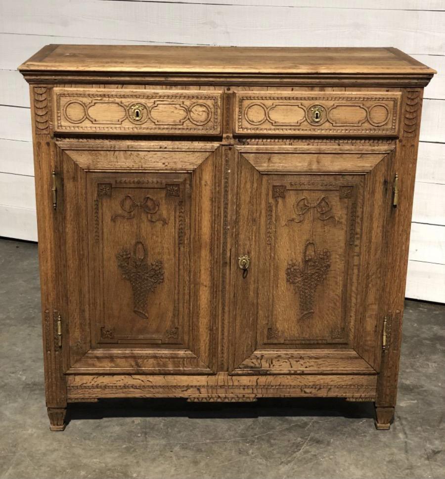 A pretty French Oak 2 Door Buffet dating to the early 19th Century. Love the 2 baskets carved into the doors. Single shelf in the bottom.
