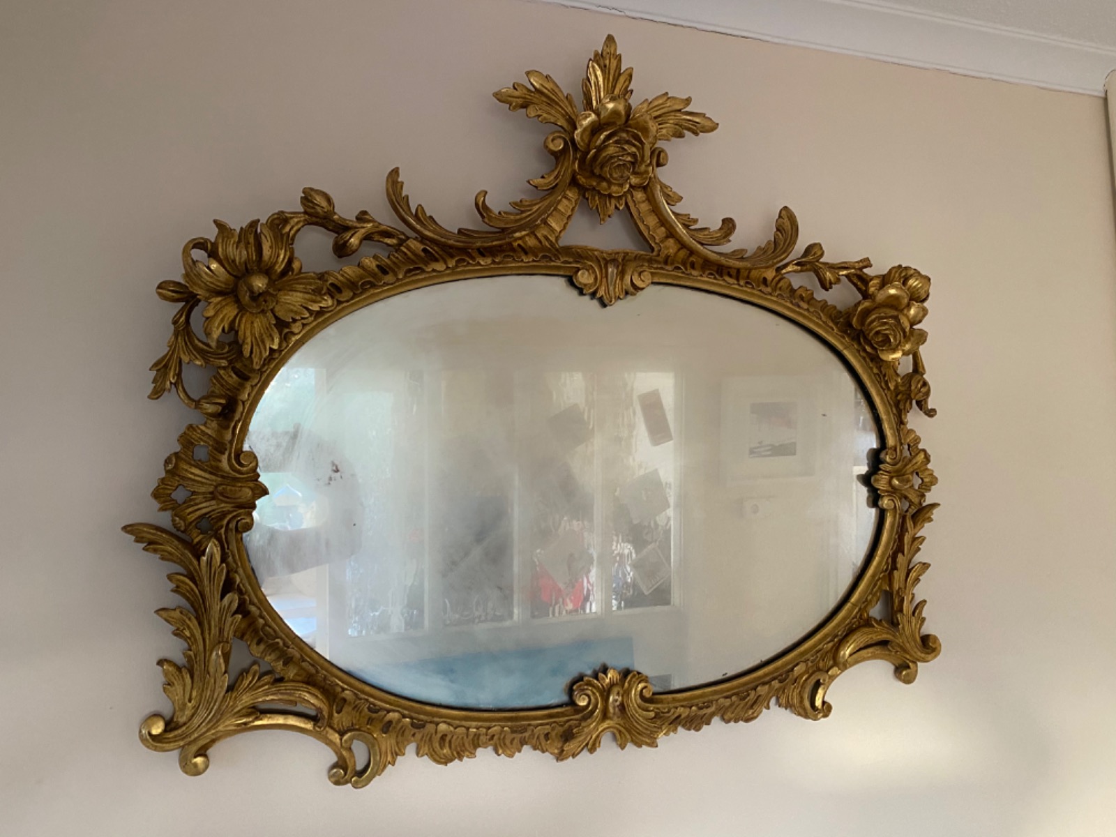 A very pretty Gilt Wood Wall Mirror, lovely rose design, we have misted the plate for some of the photos but its in perfect condition as is the frame. Would make an ideal over mantle mirror.