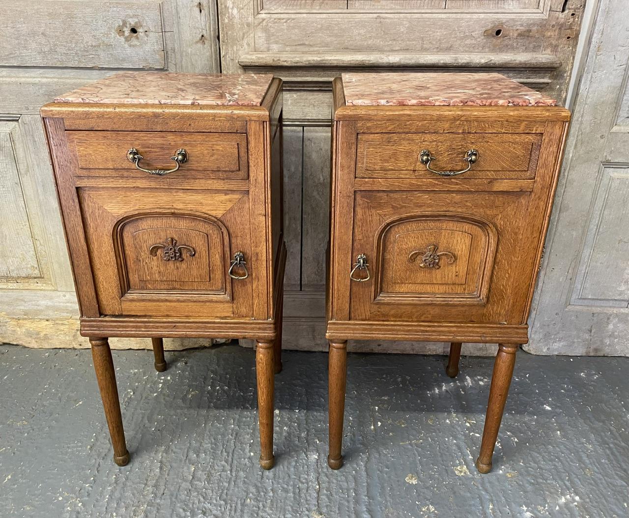 A pretty pair of French oak bedside cupboards or cabinets dating to around 1900. Made of solid oak and of good quality construction. Each has a drawer with cupboard under and their original marble tops which are in good order. They retain their original warm oak colour and are in overall very good condition.