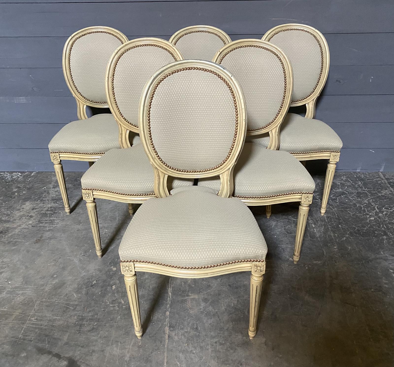 These are a lovely set of 6 French dining chairs having their original finish and patina, also possibly original upholstery which is in excellent condition. They are all strong and sturdy and comfortable.