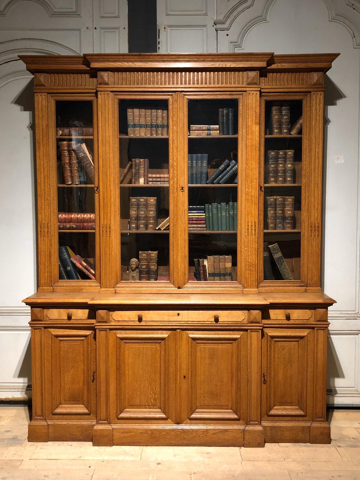 A superb quality French solid Oak Victorian Bookcase. Having 4 glazed lockable doors to the top opening to reveal adjustable shelves inside, 3 drawers under and 4 doors to the base. The craftsmanship and construction is of the finest quality and in excellent condition for the home. Keys present.