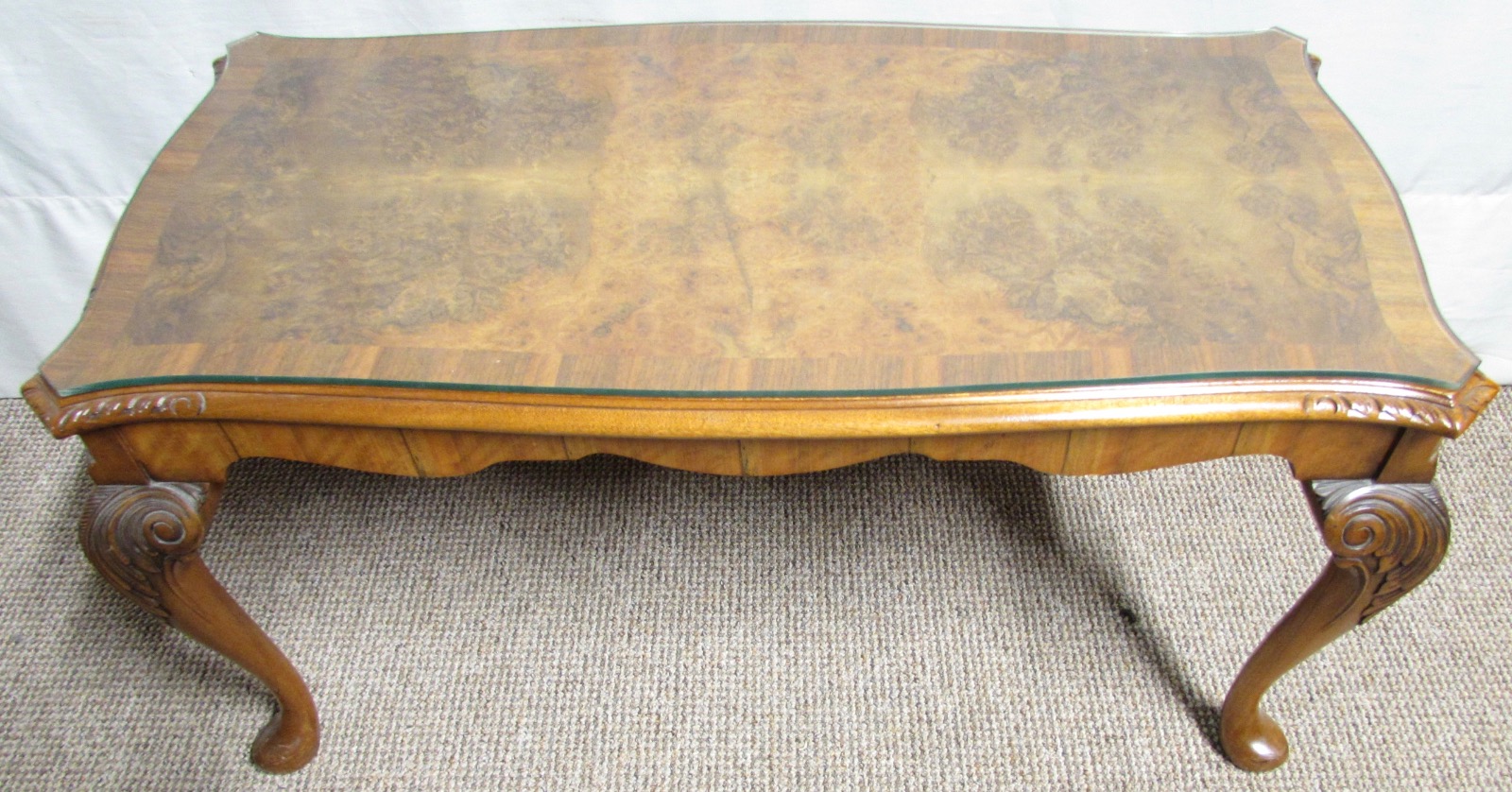 An excellent quality Coffee table, made from solid Walnut with nice Burr Walnut top. The top is shaped and she sits on Queen Anne legs. The carving is crisp and well executed. There is a plate glass top which can used or not as so desired.