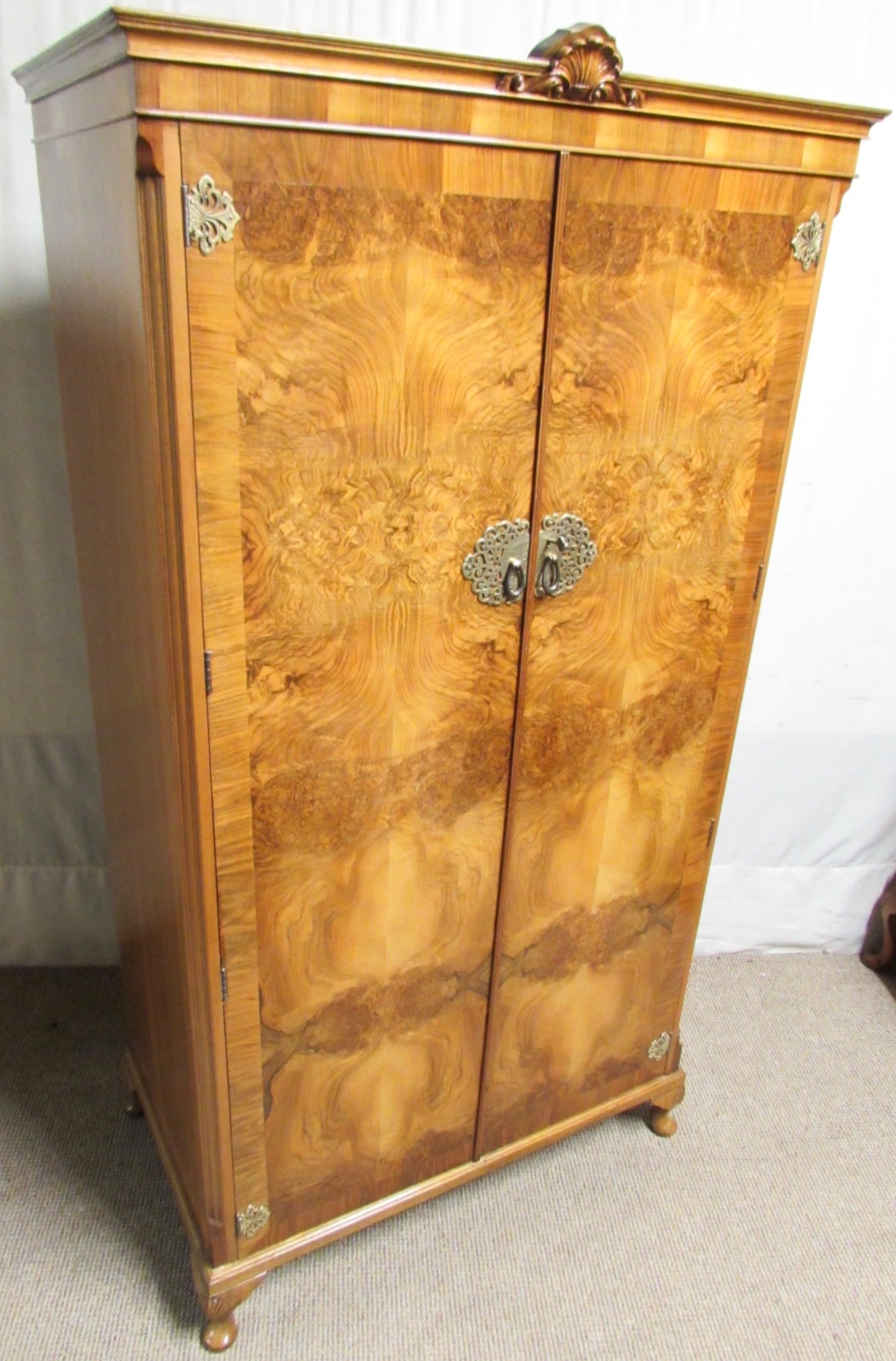 A stunning quality Burr Walnut 2 door Compactum Wardrobe, made from Walnut with very striking Burr Walnut and cross banded this really is the Rolls Royce. The interior is fitted out with naming rail, 2 glass fronted opening compartments and a drawer. The lock plate and hinges are solid brass and she sits on Queen Anne feet. The doors are lockable (key present).