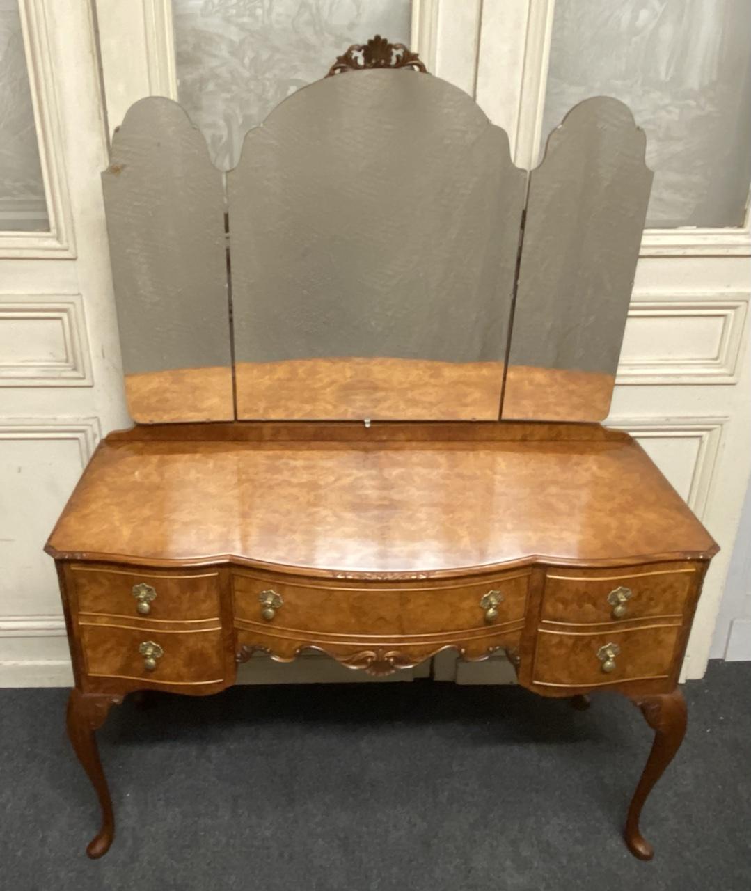 A very pretty and excellent quality Burr Walnut Dressing Table in Queen Anne style. Dating to the 1920s and having 3 mirrors which we have replaced the mirror glass in, they all move independently and the central one has a rake facility. The surface height is 79.5 cm and the kneehole 61 x 54 cm. The drawers all run smoothly and fitted with original handles. We have re finished this to a very high standard so in excellent condition for the home.