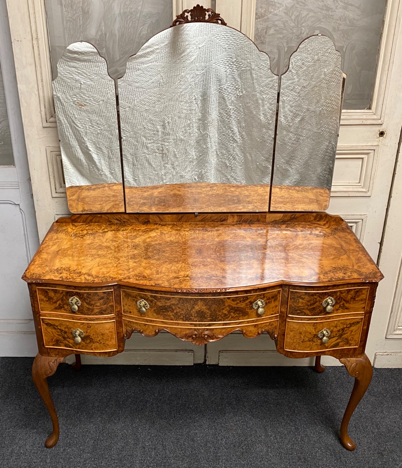 A really nice quality 'Queen Anne style' burr walnut dressing table. Excellent quality construction and made from Walnut with very good burr walnut top and front. Bow fronted in form and having 3 mirrors (new replacement plates) which all move independently, the central one has a rake adjustment bar. The drawers all run smoothly and fitted with original handles. This has a protective top which can be used or not as desired.
