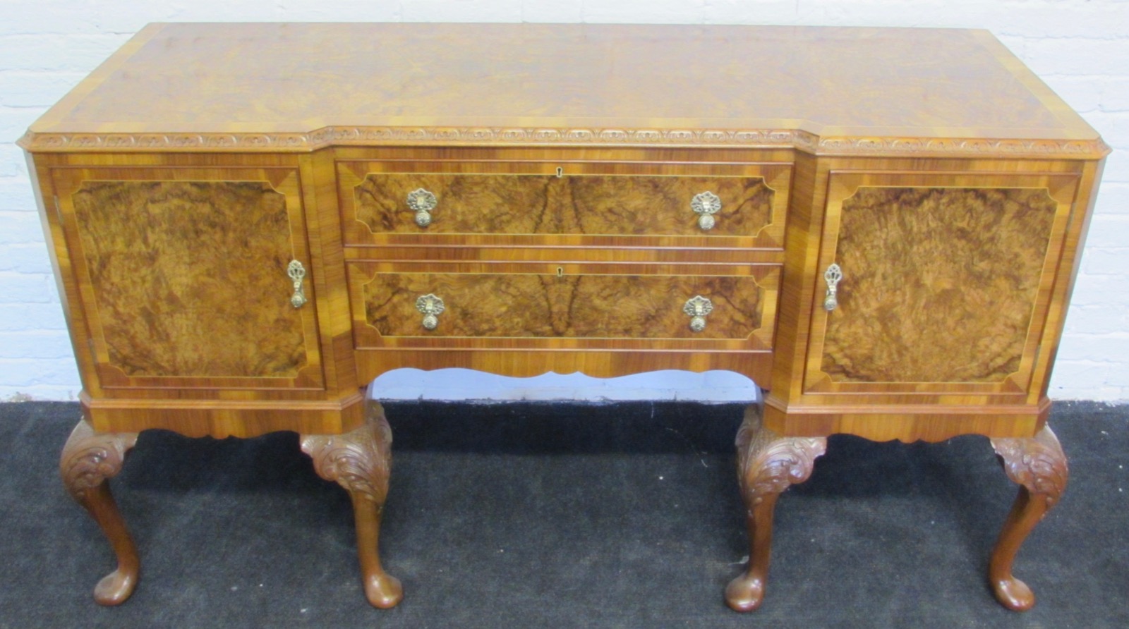Finest quality burr walnut sideboard, made from walnut and superb tight burr walnut, break front and sitting on Queen Anne legs, the 2 drawers run smoothly and all original handles. The quality of this piece is the best of the period both in craftsmanship and construction.