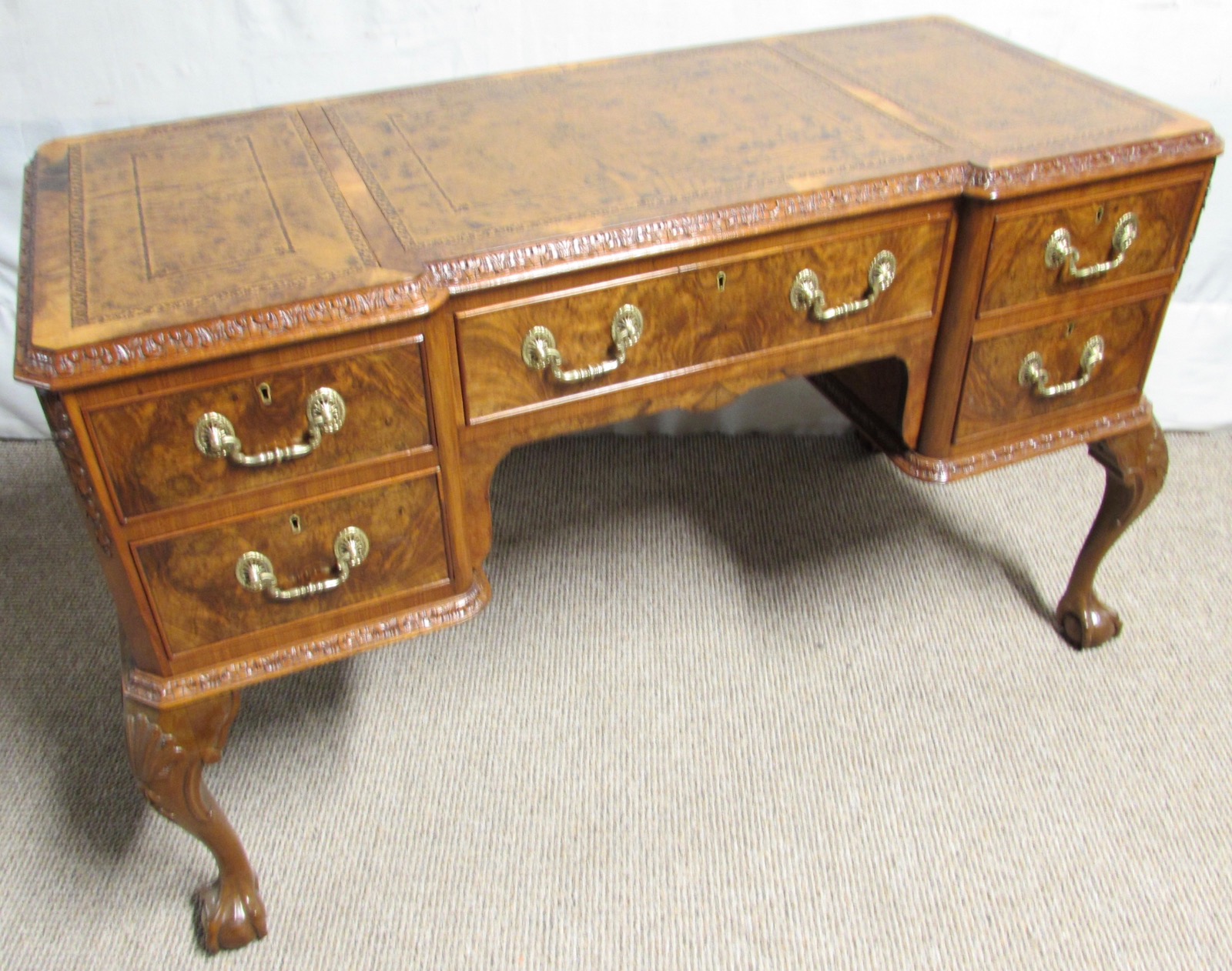 A wonderful example of the Edwardian craftsmanship, made from Walnut with nice tight Burr Walnut veneers. This is a free standing Desk and as you can see the back is equal quality to the front. The drawers all run smoothly and fitted with original Brass handles. She sits on Queen Anne legs. We have replaced the leather to the top so in excellent order. The carved decoration and the knees are crisply carved.