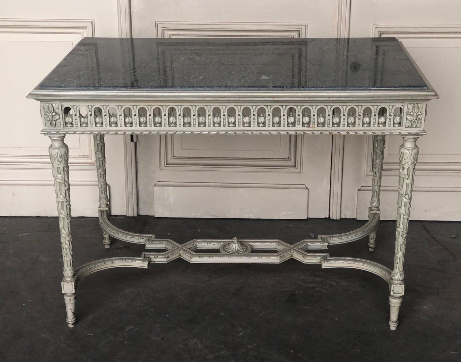 A very fine quality French Centre Table, having its original paint finish and a mottled grey marble top. The decoration to the wood carved base is crisp and very well executed.