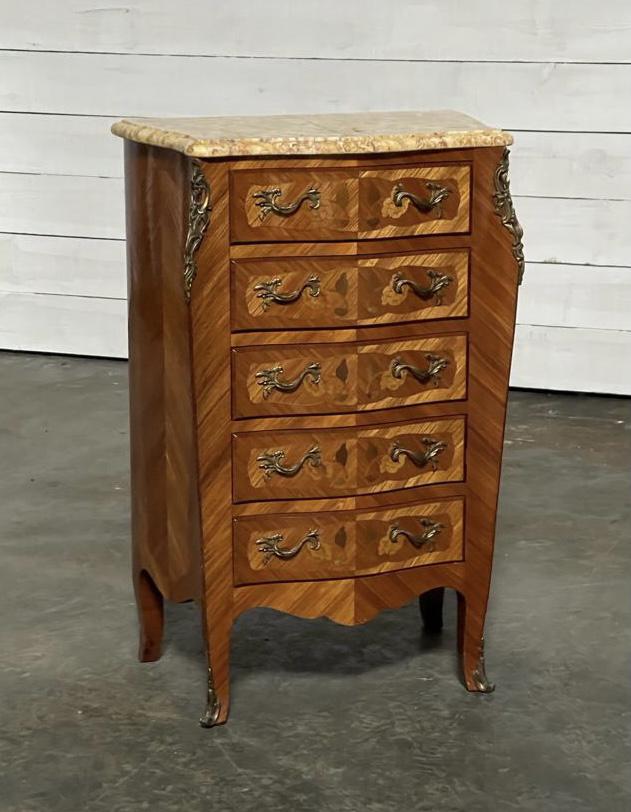 A superb quality French Taller Chest of Drawers. Stamped by a French Cabinet Maker and dating to the 1930s. Having original marble top in excellent condition and ormolu mounts. Made from Kingwood with inset marquetry. All the drawers run smoothly.