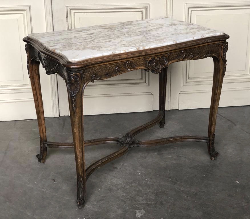 A lovely quality and very pretty French Centre or Console Table. The base is made from solid walnut and the carved decoration is crisp and well executed. The variegated marble top is in excellent condition as is the whole piece. Dating to the later part of the 19th Century.