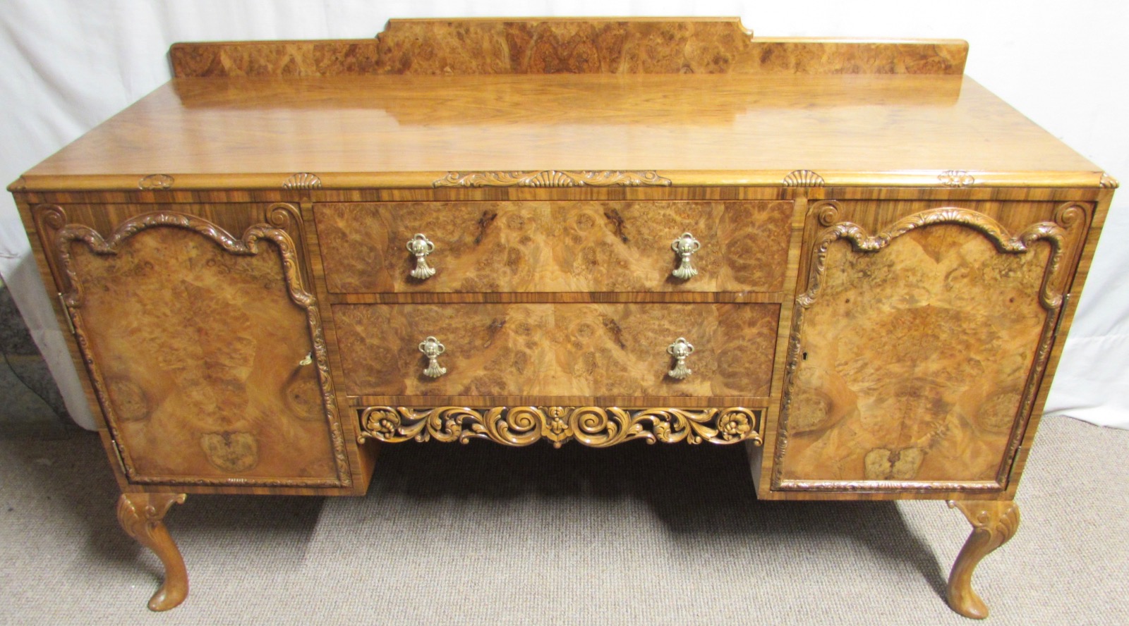 A fine quality Burr Walnut Sideboard by the renowned firm of Maple & Co. Made from Walnut with excellent tight Burr Walnut. Having 2 lockable cupboards (key present) and 2 central drawers. The carving is crisp and well executed, she sits on Queen Anne legs. This is the best quality of the period both in terms of material and craftsmanship, this can be seen in the Mahogany drawer linings and construction of.