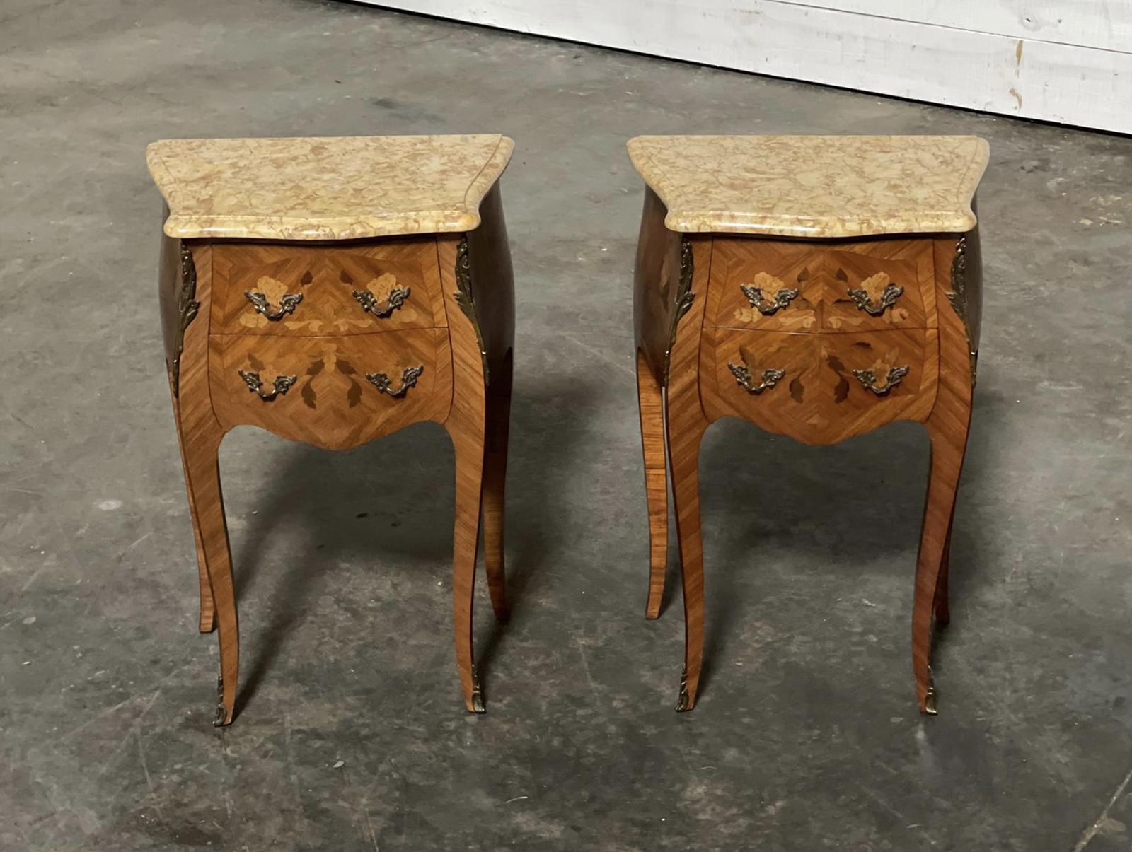 A superb quality pair of French bedside Drawers. Stamped by a French Cabinet maker and dating to the 1930s. Original marble tops in excellent condition. Made from Kingwood with inset marquetry and ormolu mounted. The drawers run smoothly.