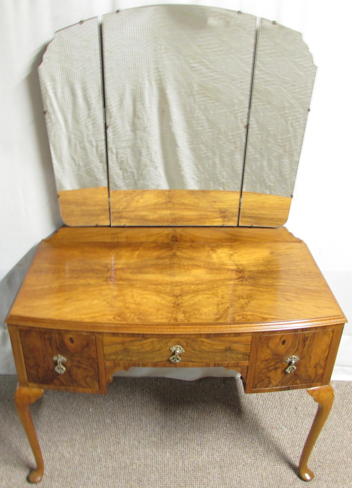 This is a nice walnut dressing table with burr to the top and front, having 3 drawers which all run smoothly and fitted with original handles. The 3 mirrors have had new plates fitted so in excellent condition and the outer 2 move in and out. She sits on Queen Anne legs.