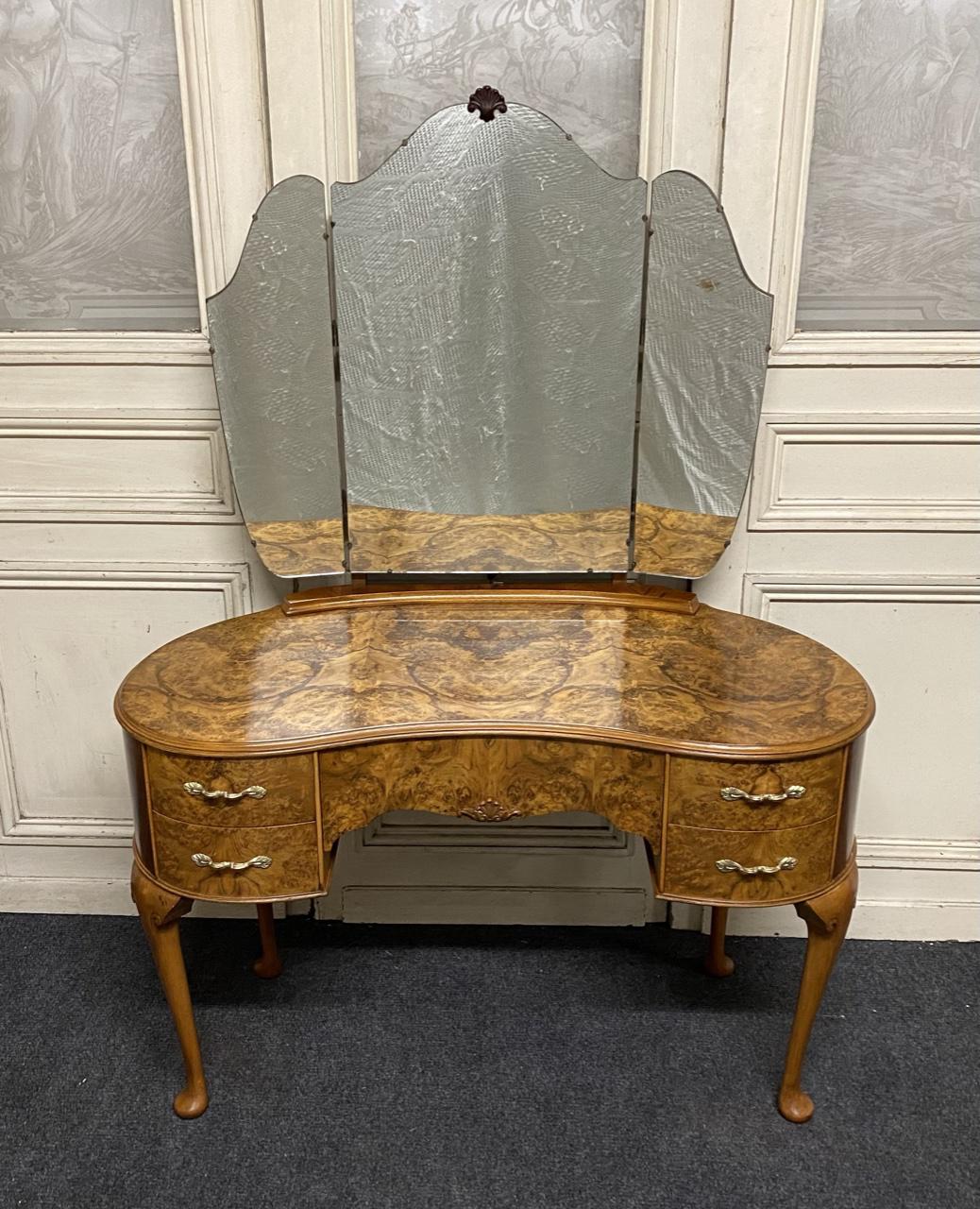 A lovely quality Dressing Table from the 1929’s. Kidney shaped and made from Walnut with excellent burr walnut to the top surface and front. The 3 mirrors move independently, all the drawers run smoothly fitted with original brass handles. The surface height is 77 cm and the kneehole 51 x 62 cm.