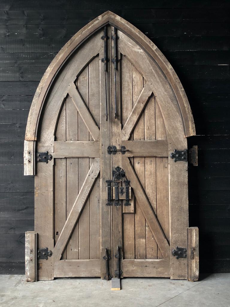 A very rare pair of Solid Oak mid 19th Century Church Doors. Also we have the top arch of the frame. Lovely original hardware attached including the heavy hinges. Basically in good condition just some wear along the bottom (see photo).