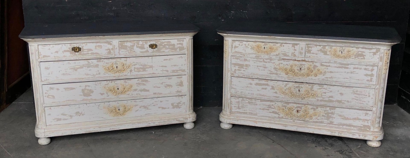 A wonderful near pair of French Chest of Drawers, I say near pair as they are identical except one is 2cm bigger than the other. All the drawers run smoothly and sitting on bun feet. The paint is somewhat antiqued which is very characterful. These charming chests are in excellent original condition for the home.