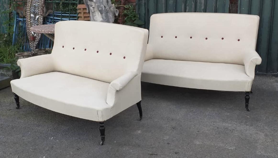 Very hard to find a pair of French Napoleon Iii sofas, settees or couches. They are strong, sturdy and comfortable. Currently upholstered in white linen and ready to be covered in your fabric of choice. All the internal upholstery and sprung seats are in good condition.