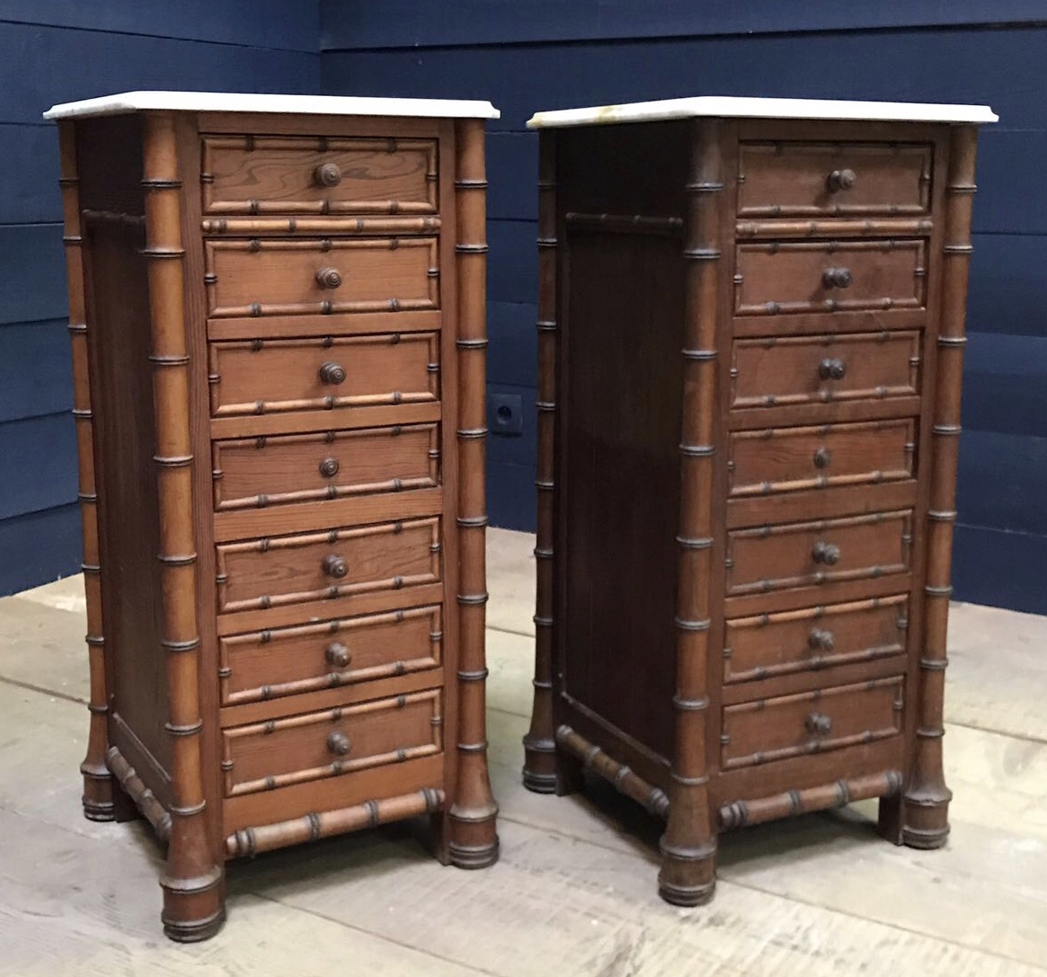 A very rare pair of late Victorian antique bedside drawers or chests, made from walnut in what is sometimes referred to as ‘faux bamboo’ style. Each having 4 smoothly running drawers and a central cupboard.