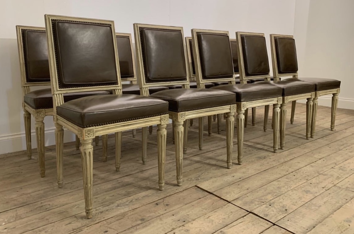 A very hard to find set of 10 French Dining Chairs, having their original paint finish and very strong and sturdy. They have been recently re covered in a brown leather which is in perfect condition and very comfortable. These are a set of very high quality Paris chairs with sprung seats and each chair is heavy.