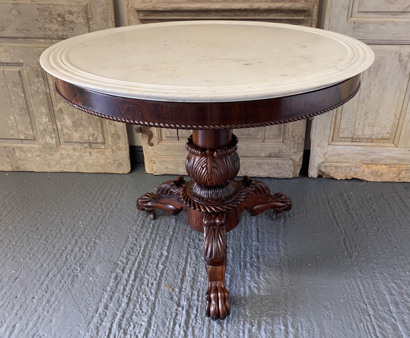 This is a wonderful French gueridon centre table dating to the Regence period. The base is solid rosewood and finely carved with paw feet and original casters. The original marble top has a nice grooving towards the edge and is pretty much perfect with just the odd flea bite to the edge.
